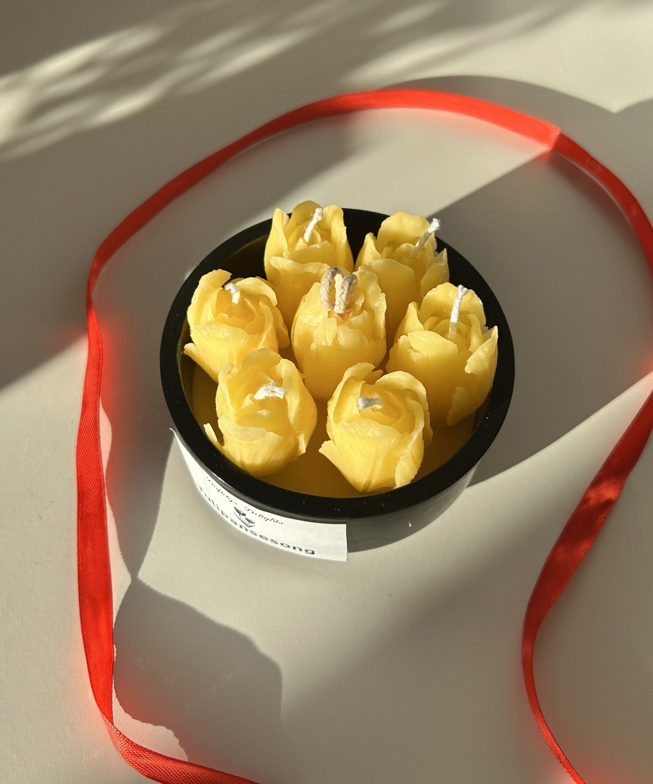 Stearinlys i mellomstort svart potte med 7 gule tulipaner 🖤🌷