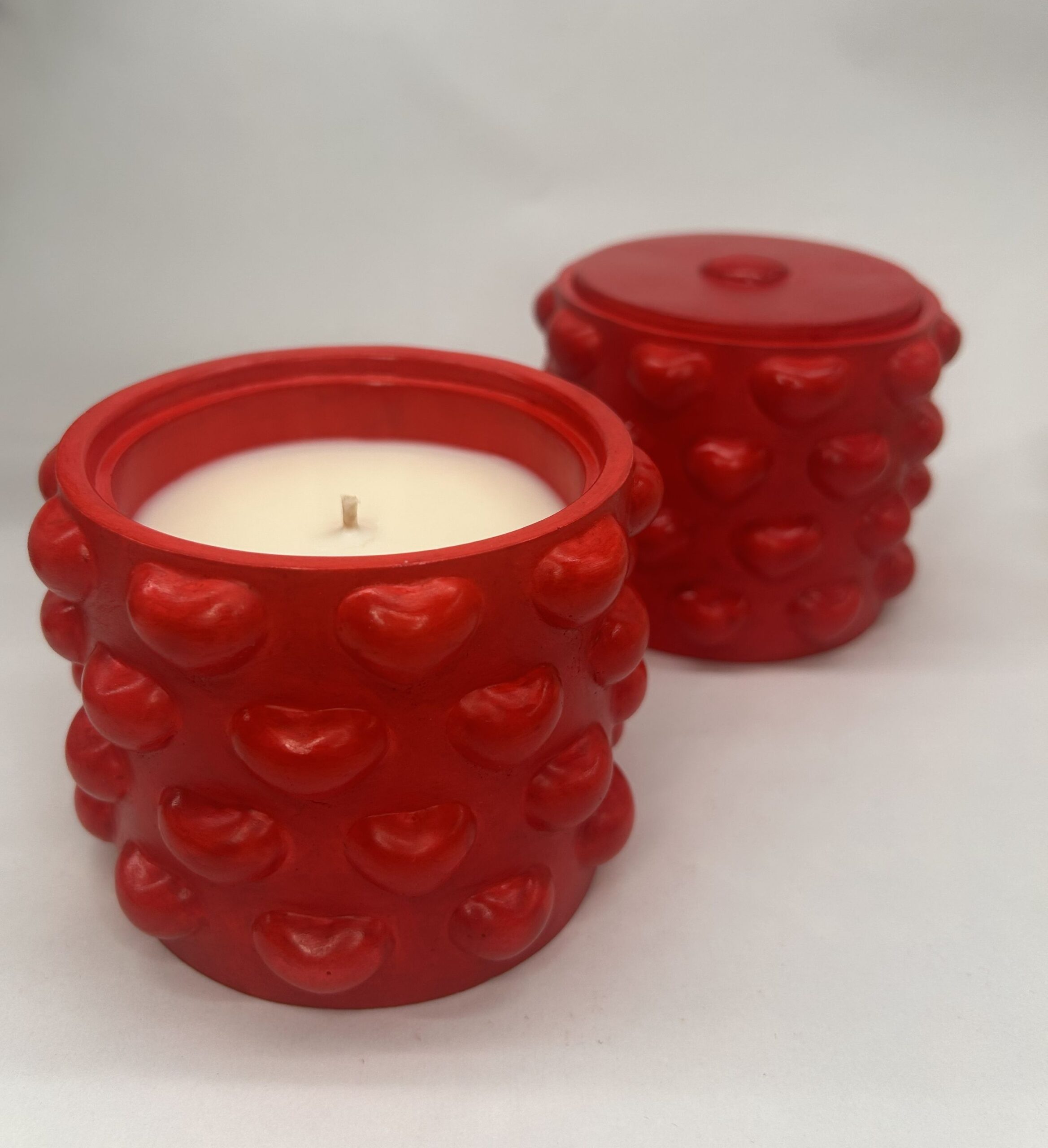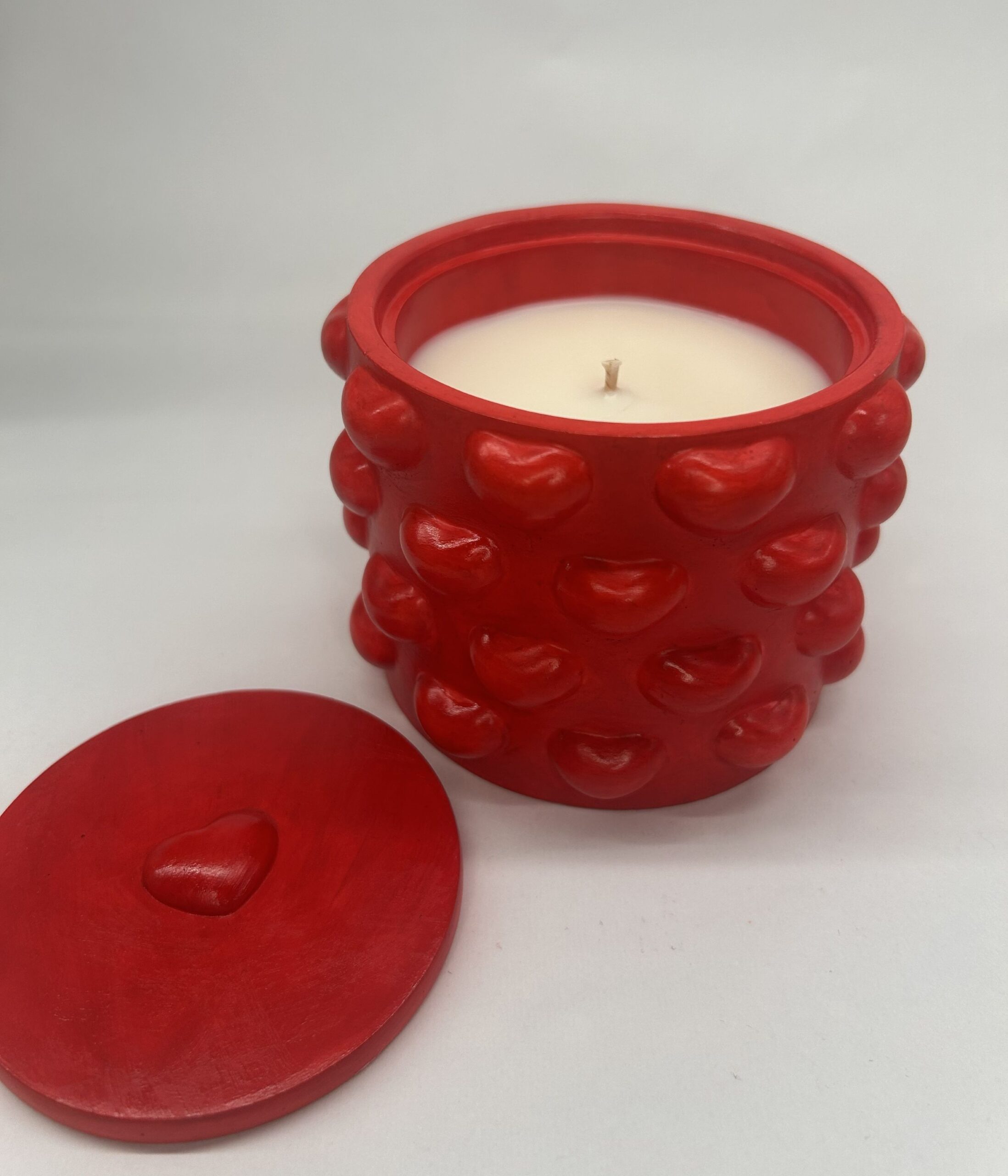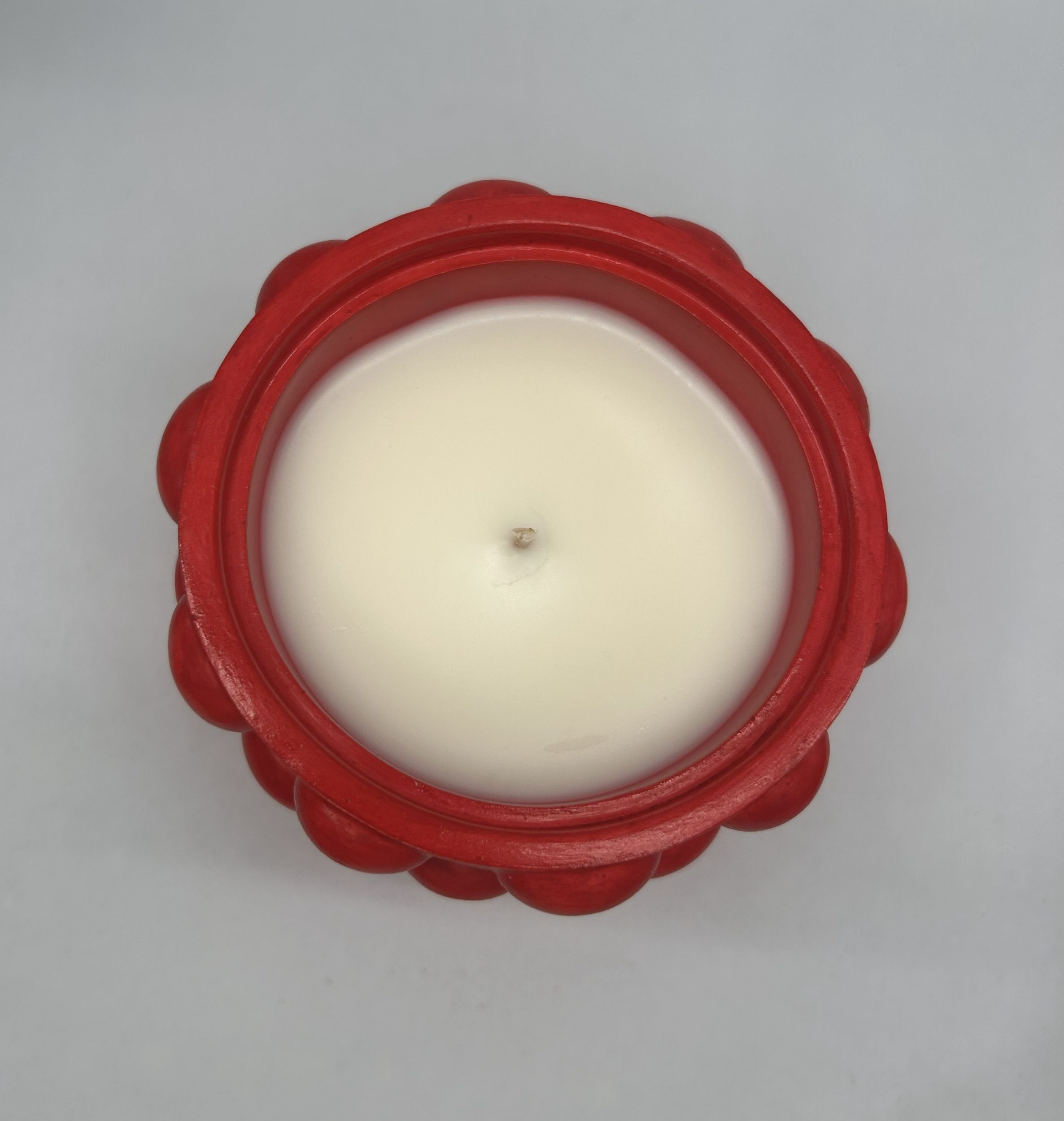 En soyavokslys i en klart rød, håndlaget gipsbeholder – skapt for varme øyeblikk og god stemning