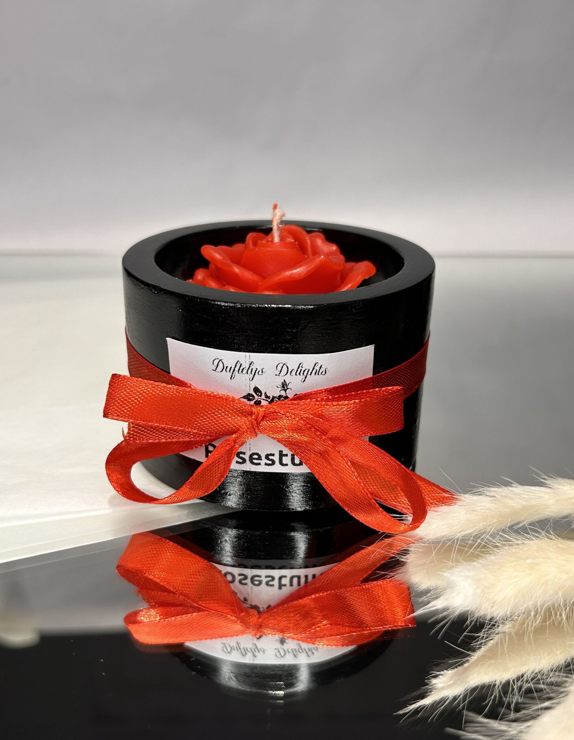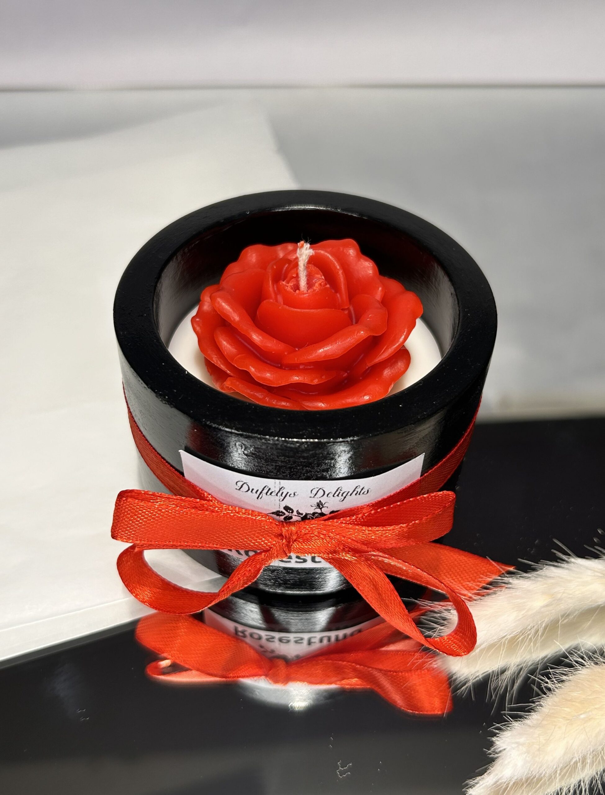 Lys i svart, glanset potte med rød rose – er en sterk og elegant kontrast 🖤🌹